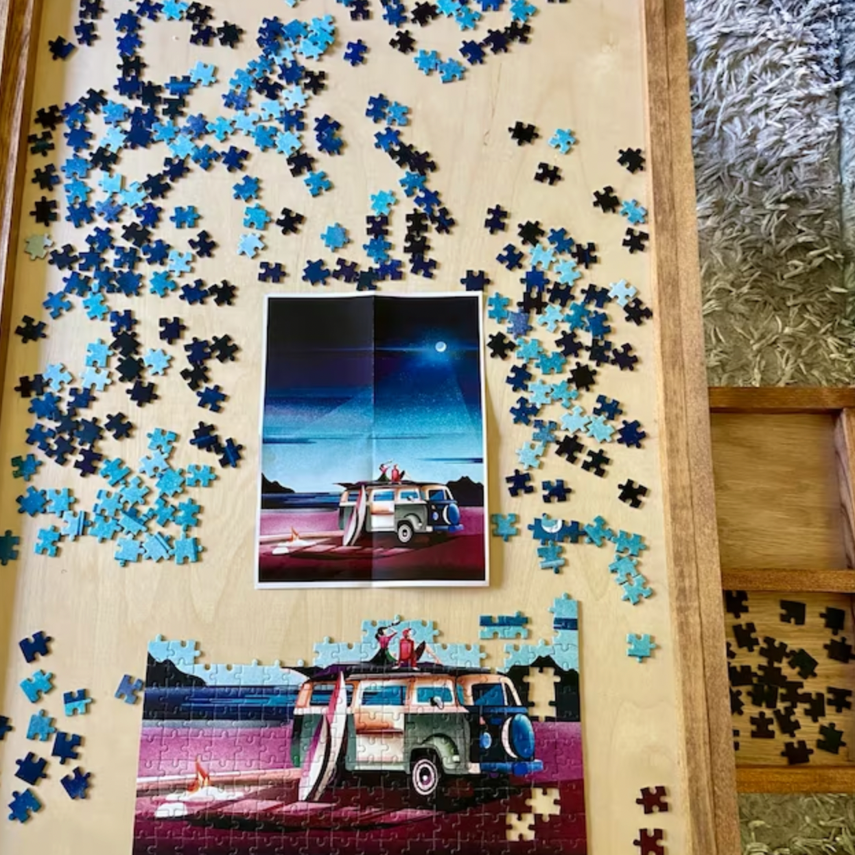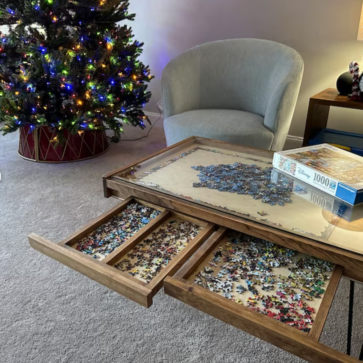 This beautiful 24x36" handcrafted rustic puzzle coffee table features a removable glass top, ample space for completing your favorite puzzles, and 2 hidden drawers to help you sort and store your puzzle or game pieces.
