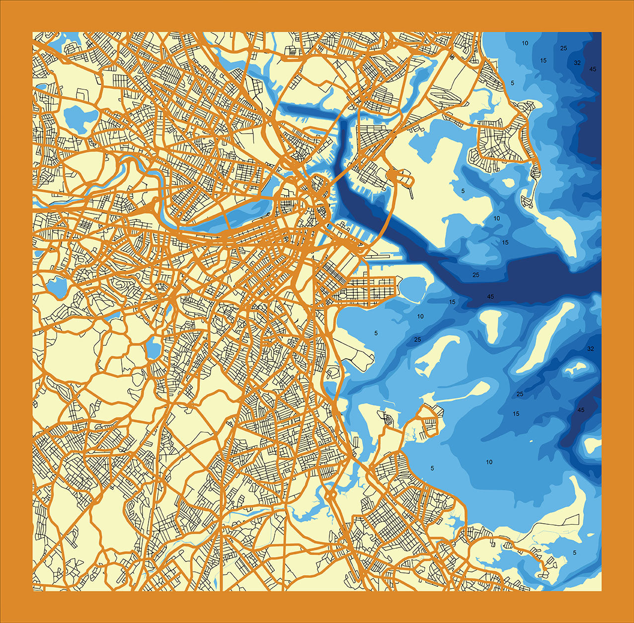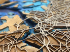 Cartographic and bathymetric (water depth) data are compiled to create a beautiful layered map full of texture and a high level of detail, beautifully stained and dyed to highlight the unique characteristics of any city.
