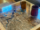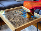 A beautiful, unique map coffee table of the city of Boston, including parts of Cambridge, Somerville, East Boston, Winthrop, Everett, Jamaica Plain, Dorchester, Roxbury and beyond.