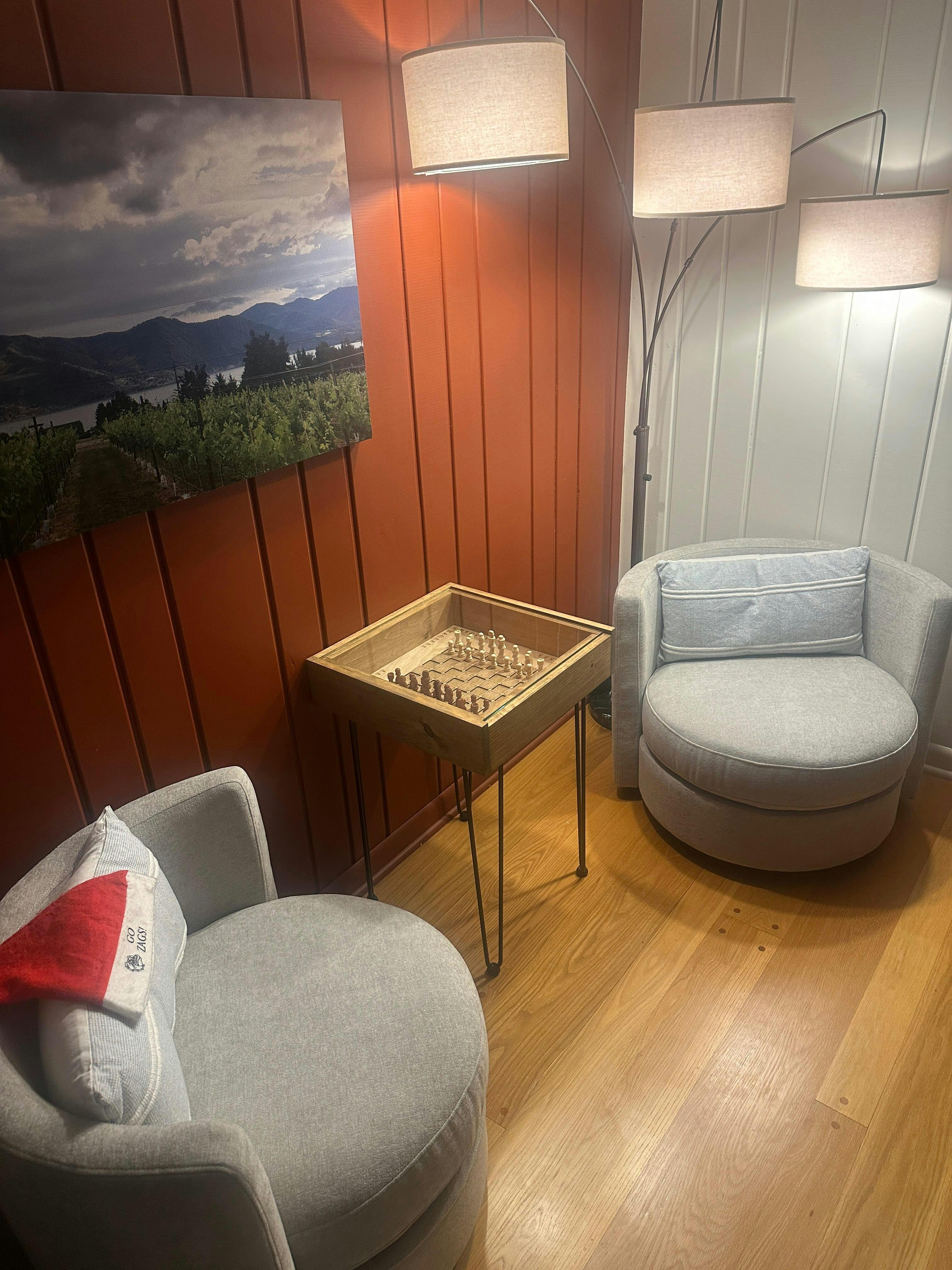 This rustic chess table is a perfect gift for any chess or checkers lover. The finely-detailed chess table features a removable tempered glass top which allows you to "pause" a great game for a break, functioning as a durable, scratch-free coffee or end table surface for drinks, food, and everyday use. When you're ready to step back into the game, the glass top easily slides off and you're ready to play. The table is framed using rustic stained and clear-coated pine. 4 sturdy steel hairpin legs provide plenty of support with minimal foot interference, and can easily be removed for moving/storage.